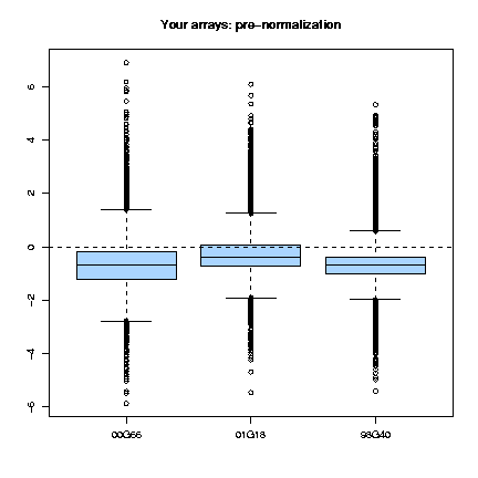Boxplots of the pre- and post-normalization intensity log-ratios M for all your arrays