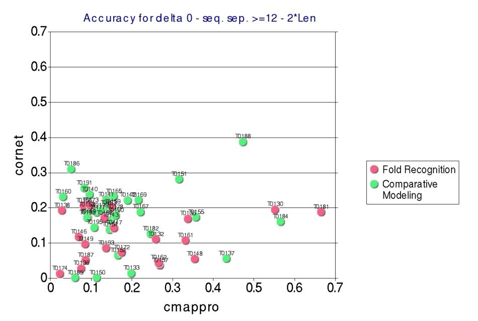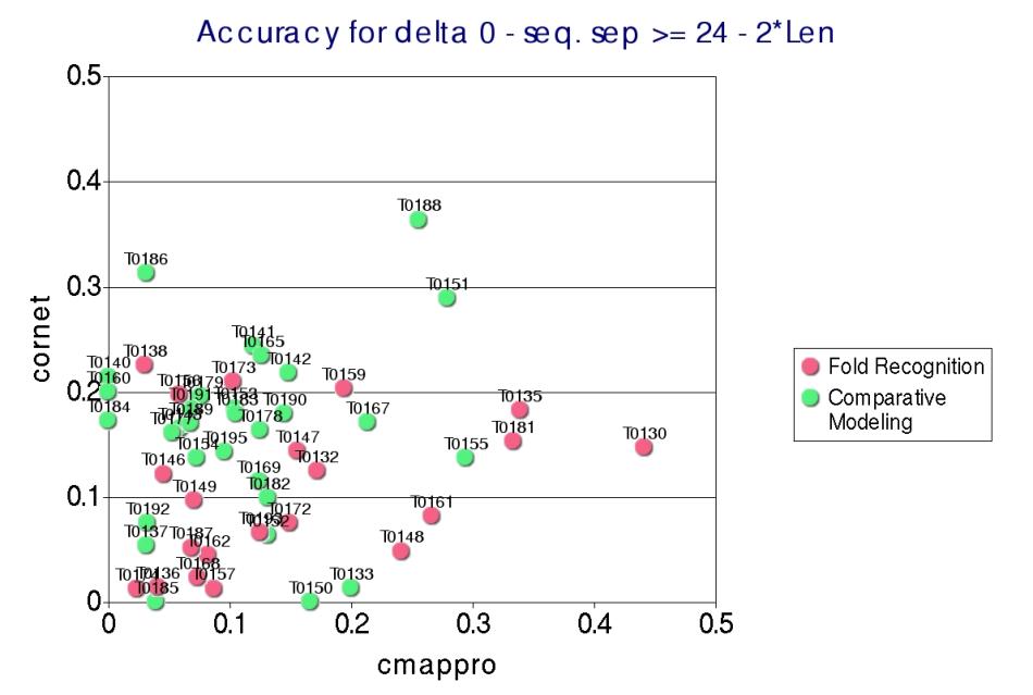 In this page, a comparison of the Accuracy between CMAPPRO and CORNET for the predicted targets is shown. First graph corresponds to a sequence separation >= 12 between each residue in the pair and taking 2*Len pairs. Second graph corresponds to a sequence separation >=24 between each residue in the pair taking also 2 * Len pairs.